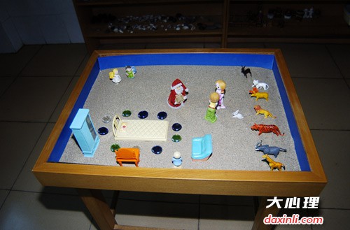 治疗是通过提供一个机会,让被治疗者在一个内侧尺寸约为57×72×7(cm),外侧涂深颜色或木本色,内侧涂蓝色的湿沙盘或干沙盘中,使用或不使用小物件来配置沙子以及创造一个场景。这个场景,是被治疗者用意像来呈现发生在个人内在或外在的世界状况,视觉形式取代了口语交谈,因此也绕过了防御。把内在情结物质化为视觉形式,也有利于把被治疗者不断招回到对情结的体验和思考中去,减弱了阻抗。当治疗师信任被治疗者的潜意识心智会透露出迈向自我发现的独特道路时
